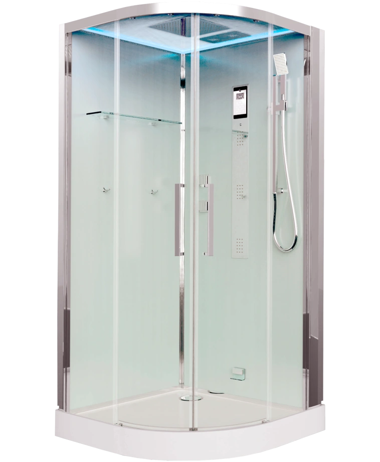 Габариты (Ш Г): 100x100 см. Верхний душ расположен в крыше кабины. Кабина оснащена гидромассажем. Кабина оснащена парогенератором, при помощи которого создается эффект турецкой бани. Раздвижная система дверей. Двери с прозрачным полотном. Дверцы из стекла. Ширина входа: 45 см. Имеет сенсорный дисплей / оснащена пультом дистанционного управления. С полкой. Поддон кабины оснащен антискользящим покрытием. С гидромассажем спины. Верхнее освещение. Кабина с вентиляцией. Установлено радио. Температура в бане/сауне регулируется. Оснащена функцией хромотерапии (оздоровления цветом). Возможно подключение к внешней аудиосистеме. Имеет функцию громкой связи, позволяет отвечать на телефонные звонки. Глубина поддона: 2 см. Акриловый поддон. Оснащение: Сифон. Крючки. Пульт ДУ. Душевой гарнитур. Гарантия: 1 год. Финляндия.