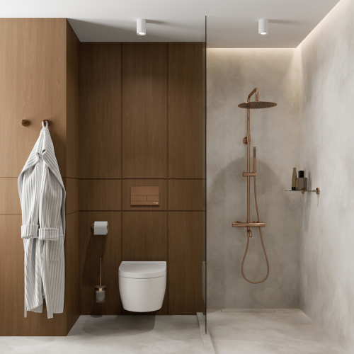 Душевая насадка Ø 300 мм, 168 форсунок, нержавеющая сталь, Стойка для душа, Ø 24 мм, регулируемая по высоте, Лейка 1-функциональная с системой защиты от известковых отложений, Шланг металлический 1500 мм, подключение к лейке, Термостатический смеситель, Термостатический картридж Vernet (Франция), Встроенный пластиковый аэратор Neoperl HONEYCOMB (Германия) с регулируемым углом наклона струи, Обратный клапан Neoperl (Германия), Керамический поворотный переключатель, Набор для монтажа