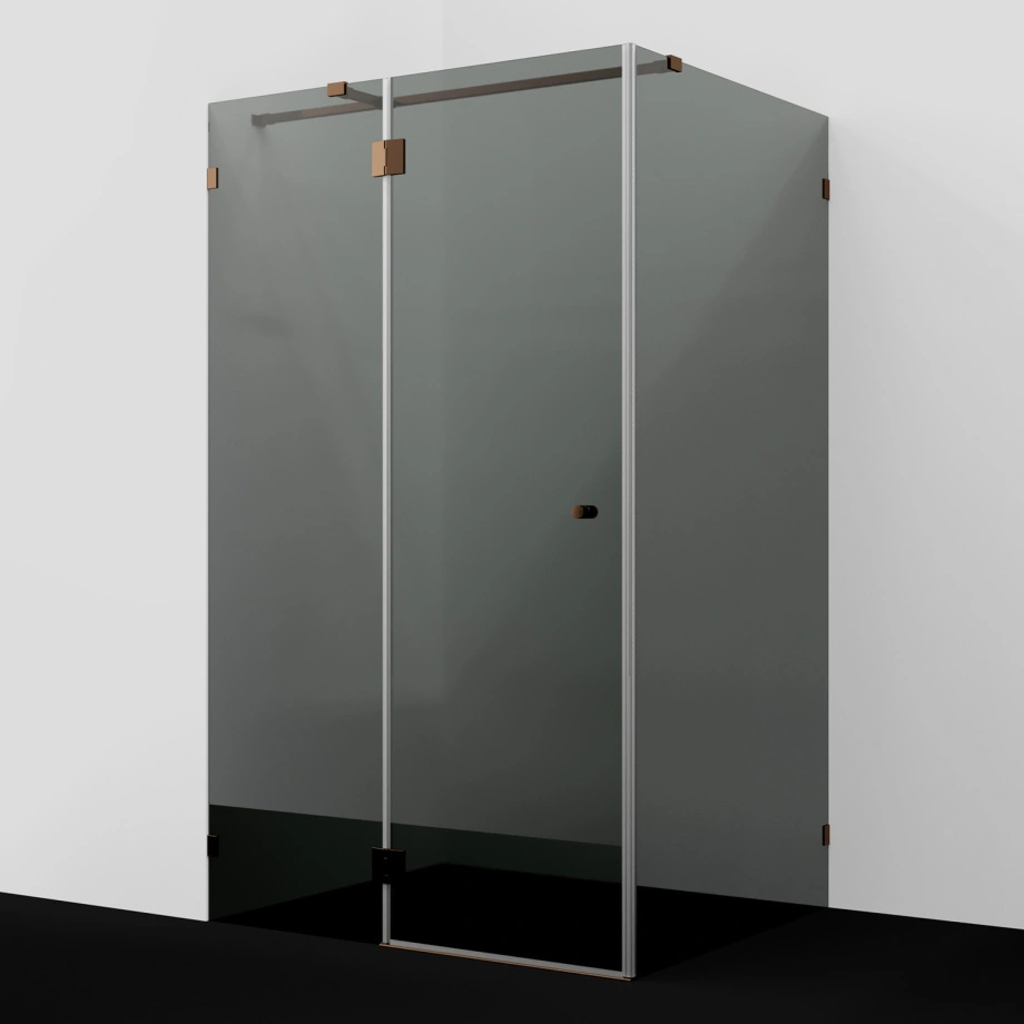 Закаленное тонированное стекло 8 мм, Покрытие стекла WasserSchutz, Распашной механизм на петлях из латуни, Беспрофильное исполнение, Крепление к стене фиксированными петлями из латуни, Ручка нержавеющая сталь AISI304, Силиконовый уплотнитель двери с магнитным замком, Силиконовые уплотнители, Комплект фурнируты, Цвет фурнитуры: розовое золото, Универсальная установка