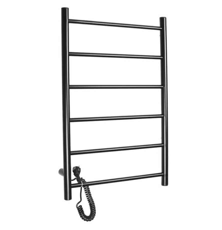 Электрический полотенцесушитель из нержавеющей пищевой стали. Цвет черный матовый. Вертикальные стойки имеют диаметр 32 мм., горизонтальные перекладины выполнены из трубы диаметром 18 мм.