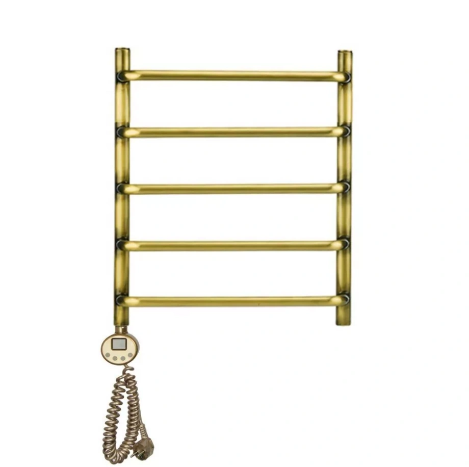 Электрический полотенцесушитель из латуни марки Л59. Цвет «Античная бронза». Труба цельнотянутая. Вертикальные стойки имеют диаметр 28 мм., горизонтальные перекладины выполнены из трубы диаметром 18 мм. ТЭН имеет цифровой терморегулятор, температура регулируется от 35 до 70 градусов. Встроен таймер автоотключения на 2 и 4 часа. ТЭН оснащён термодатчиком, который защищает устройство от перегрева. Поставляется в сборном виде. Возможно скрытое подключение.