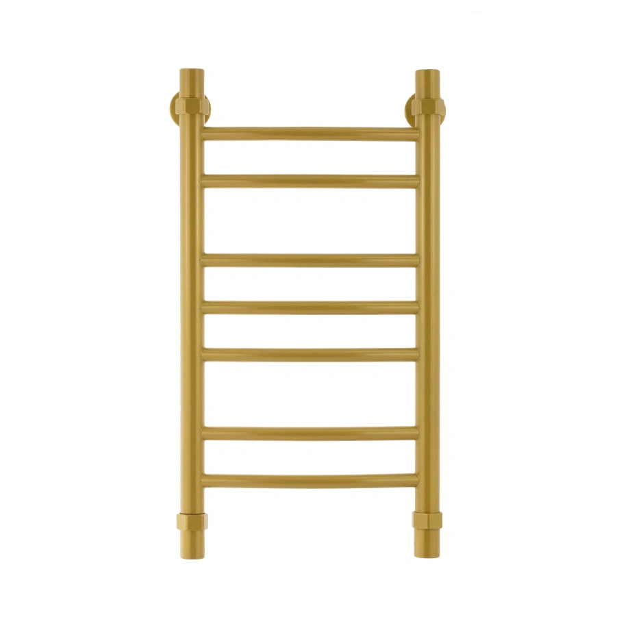 Этот стильный полотенцесушитель выполнен в виде лесенки с выпуклыми перемычками, собранными в группы по высоте устройства. Золотой цвет придает ему элегантность и классический вид. Благодаря компактности (ширина всего 360 мм), он идеально подходит для установки даже в ограниченных пространствах, таких как ниши, углы или простенки.