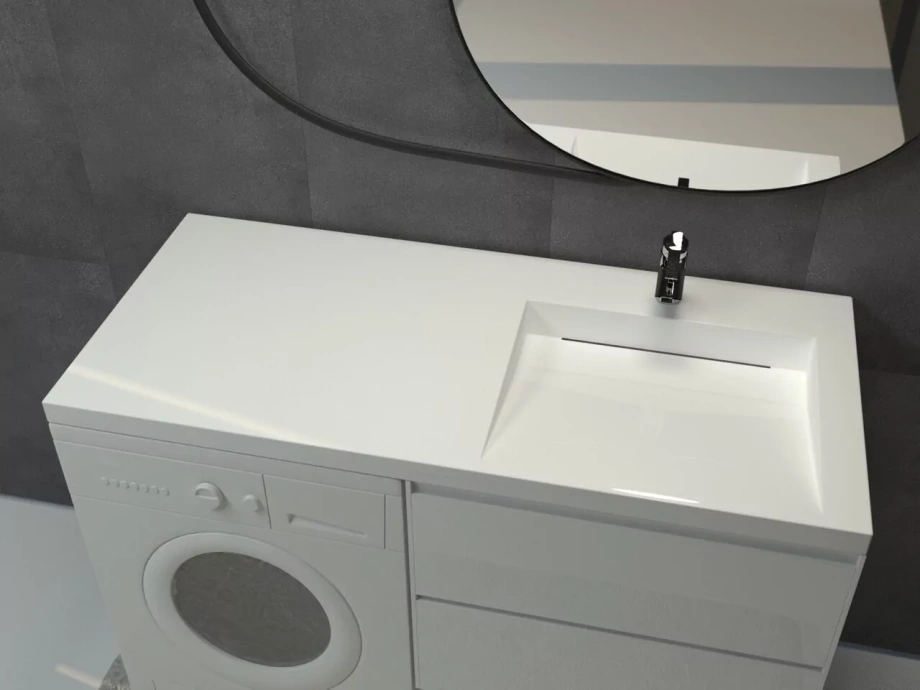 Монтаж раковины: над стиральной машиной. Форма раковины: прямоугольная. Цвет раковины: белый. Материал раковины: искусственный мрамор. Покрытие: гелькоут. Высота раковины - 180 мм. Ширина раковины - 1200 мм. Глубина раковины - 549 мм.