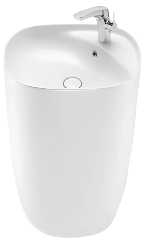 Монолитная раковина с пьедесталом, которая полностью закрывает канализационные соединения.