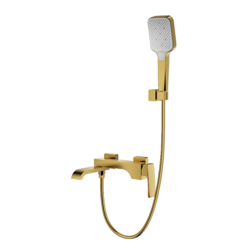 Смеситель для ванны Raglo R02.30.03. Цвет: сатин золотой. Материал: латунь. Управление: однорычажное. Механизм: керамический картридж. Излив: поворотный. Тип излива: каскадный. Количество режимов струи ручного душа: 3. Отверстия для монтажа: 2. Монтаж: на стену.