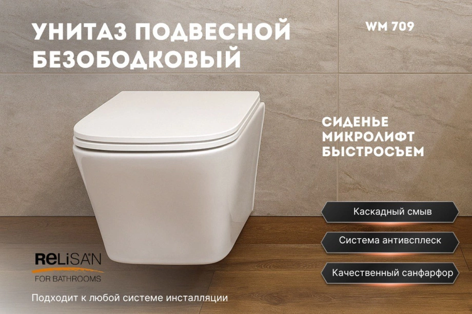 Современный подвесной унитаз Relisan — сочетание элегантного дизайна, гигиеничности и комфорта.