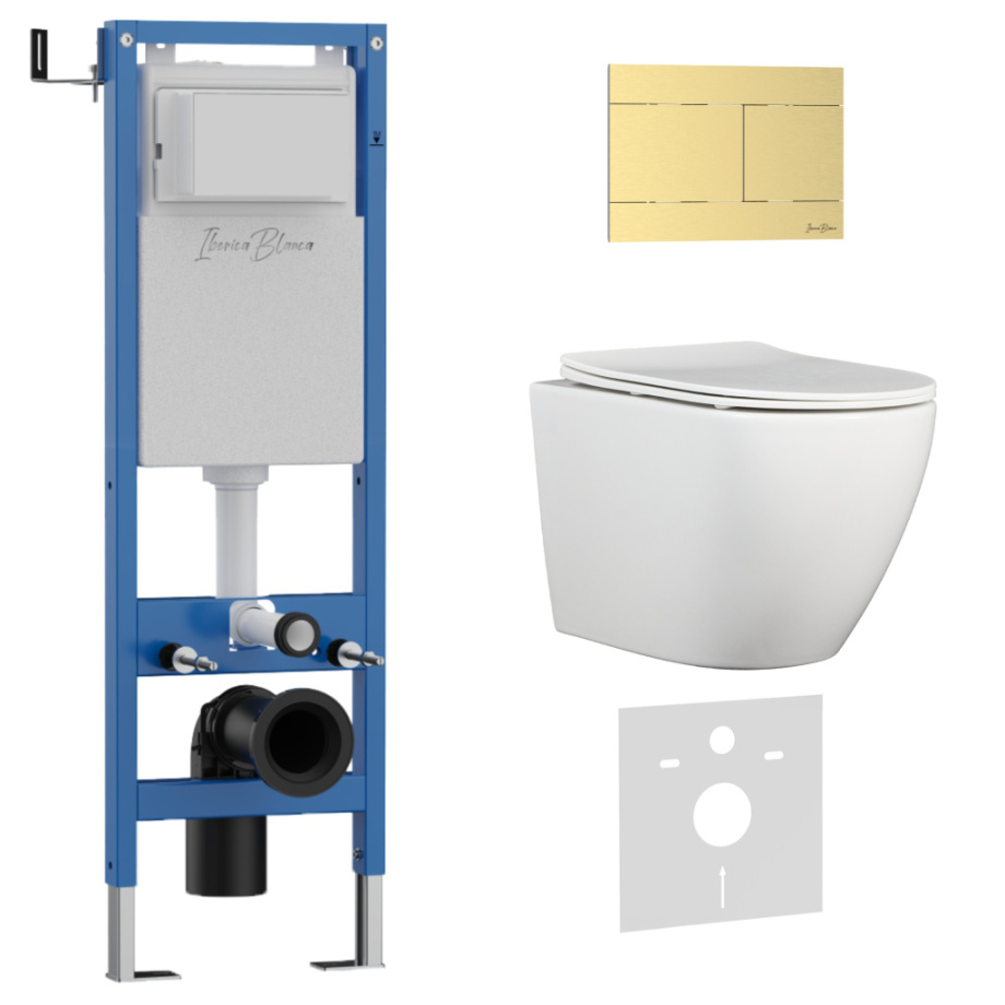 Комплект 3в1 IBERICA BLANCA инсталляция SILENCIO MINI, унитаз BILBAO ALTO белый, кнопка смыва INOX-R золото матовое (IB.001M.BLA.234.1503)
