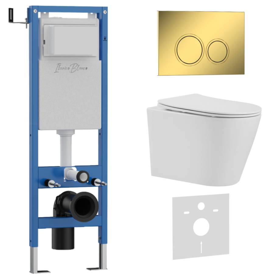 Комплект 3в1 IBERICA BLANCA инсталляция SILENCIO MINI, унитаз BURGOS ALTO белый, кнопка смыва ESTI-O золото глянцевое (IB.001M.BRA.231.826)