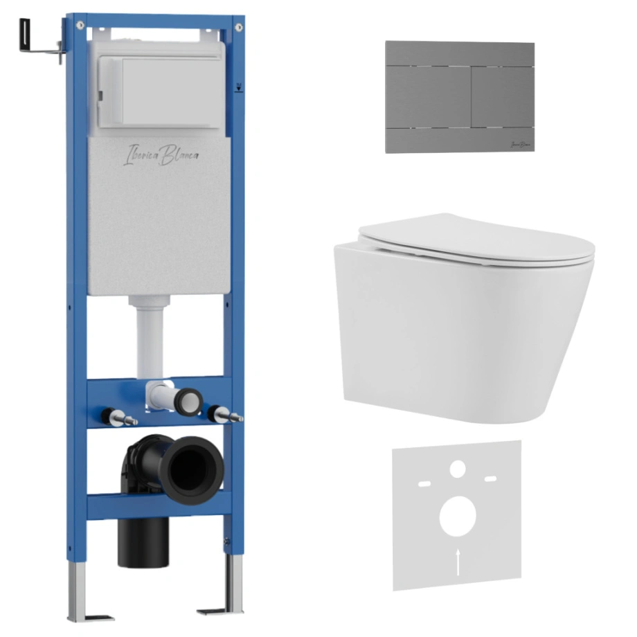 Комплект 3в1 IBERICA BLANCA инсталляция SILENCIO MINI, унитаз BURGOS ALTO белый, кнопка смыва INOX-R вороненая сталь (IB.001M.BRA.231.1502)