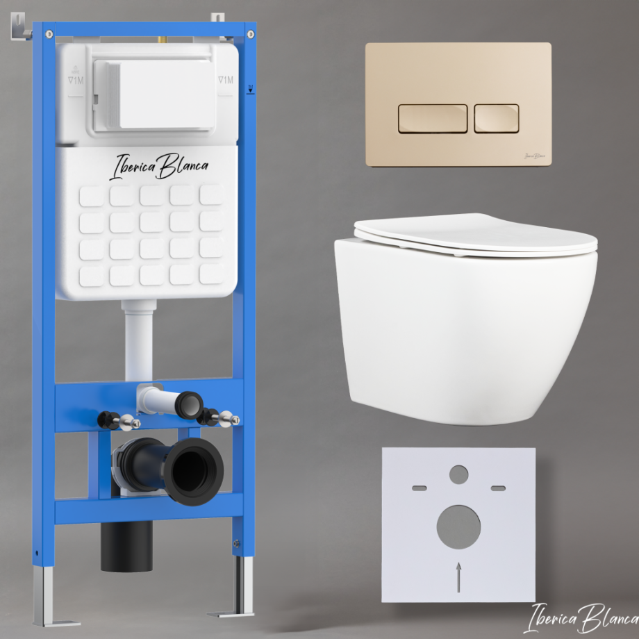 Комплект 3в1 IBERICA BLANCA инсталляция SILENCIO, унитаз BILBAO ALTO белый, кнопка смыва ESTI-R золото матовое (IB001.BLA.234.215)