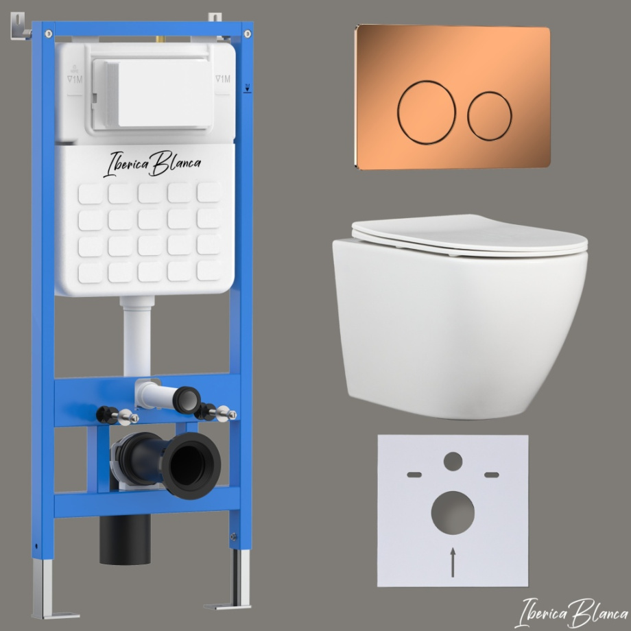 Комплект 3в1 IBERICA BLANCA инсталляция SILENCIO, унитаз BILBAO ALTO белый, кнопка смыва INOX-О розовое золото глянцевое (IB001.BLA.234.8171)