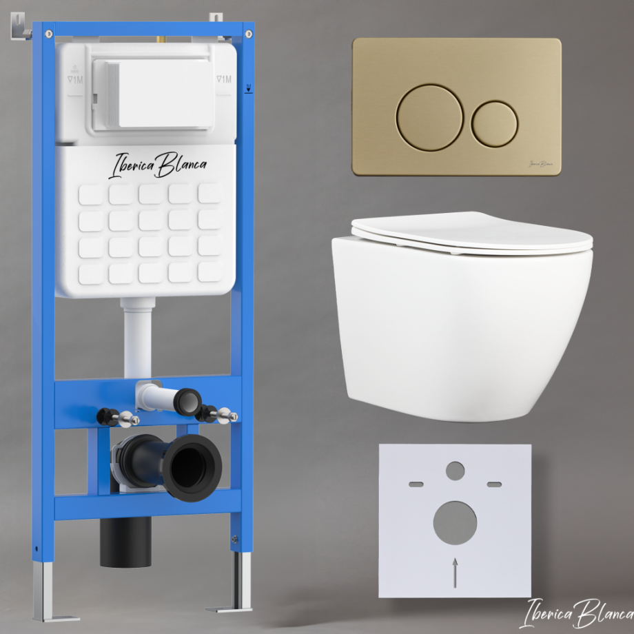 Комплект 3в1 IBERICA BLANCA инсталляция SILENCIO, унитаз BILBAO ALTO белый, кнопка смыва INOX-O золото матовое (IB001.BLA.234.815)