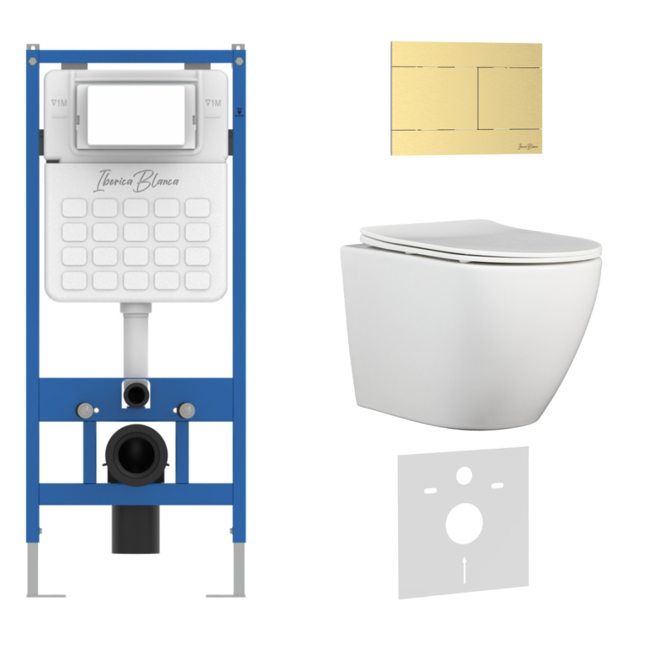 Комплект 3в1 IBERICA BLANCA инсталляция SILENCIO, унитаз BILBAO ALTO белый, кнопка смыва INOX-R золото матовое (IB001.BLA.231.1503)