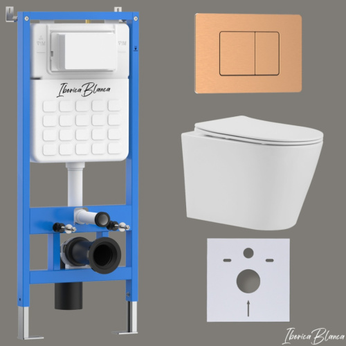 Комплект 3в1 IBERICA BLANCA инсталляция SILENCIO, унитаз BURGOS ALTO белый, кнопка смыва INOX-C розовое золото матовое (IB001.BRA.234.1172)