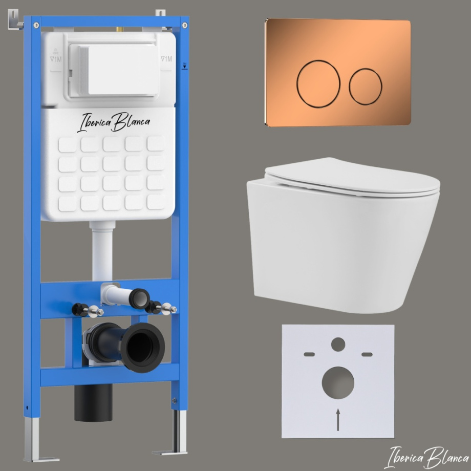 Комплект 3в1 IBERICA BLANCA инсталляция SILENCIO, унитаз BURGOS ALTO белый, кнопка смыва INOX-О розовое золото глянцевое (IB001.BRA.234.8171)