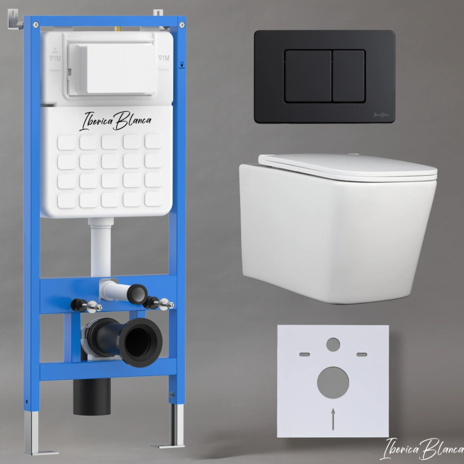 Комплект 3в1 IBERICA BLANCA инсталляция SILENCIO, унитаз TOLEDO ALTO белый, кнопка смыва INOX-C черный матовый (IB001.TLA.231.112)