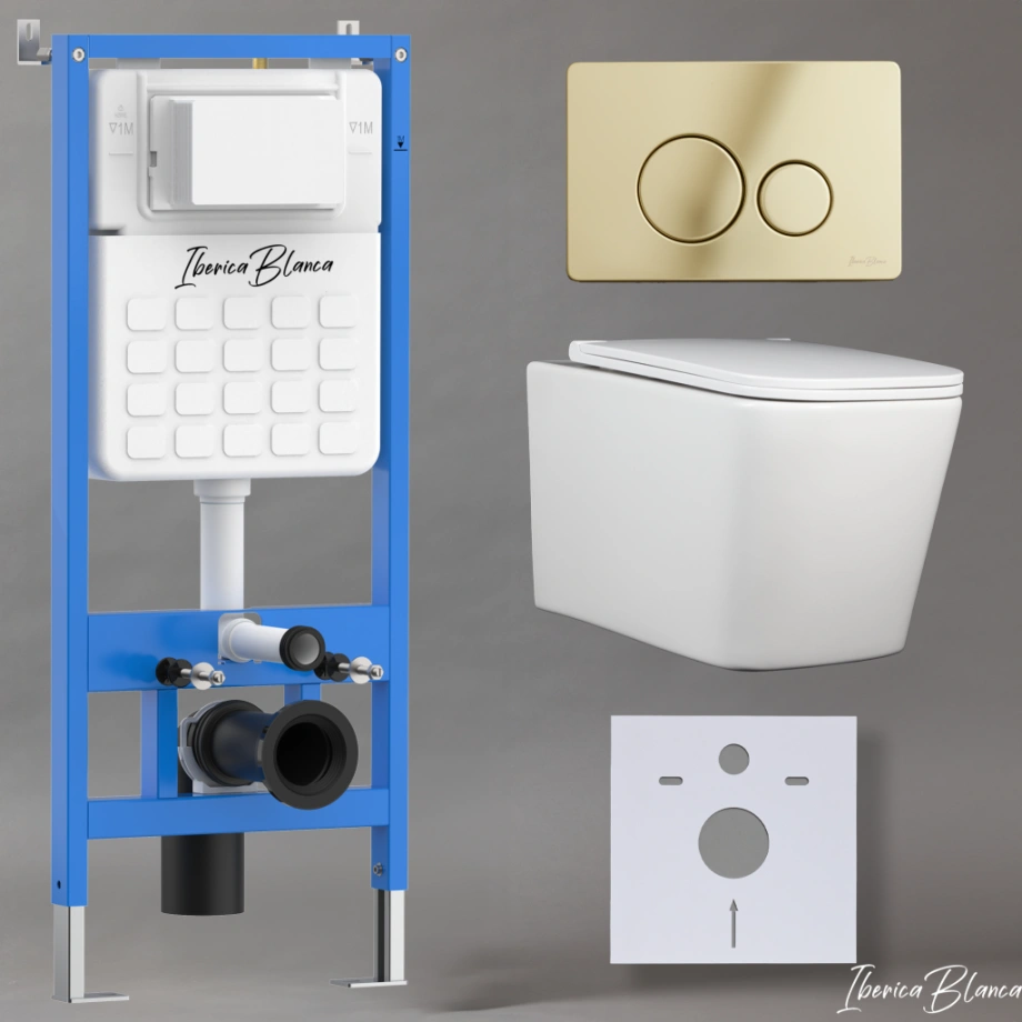 Комплект 3в1 IBERICA BLANCA инсталляция SILENCIO, унитаз TOLEDO ALTO белый, кнопка смыва INOX-O золото глянцевое (IB001.TLA.231.816)