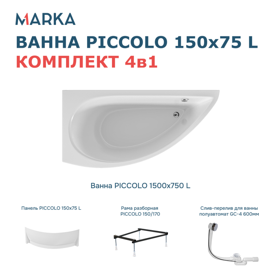 Ванна 1Marka PICCOLO 150*75 L Комплект Премиум