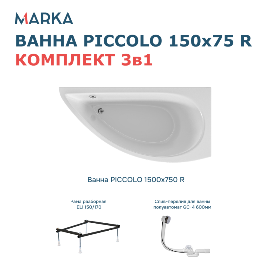 Ванна 1Marka PICCOLO 150*75 R Комплект Стандарт 2+